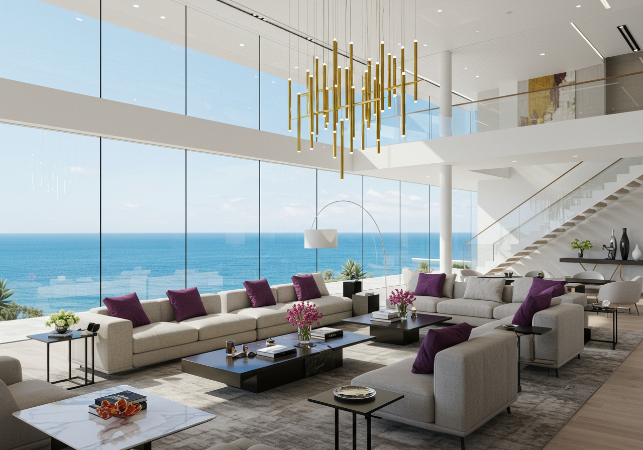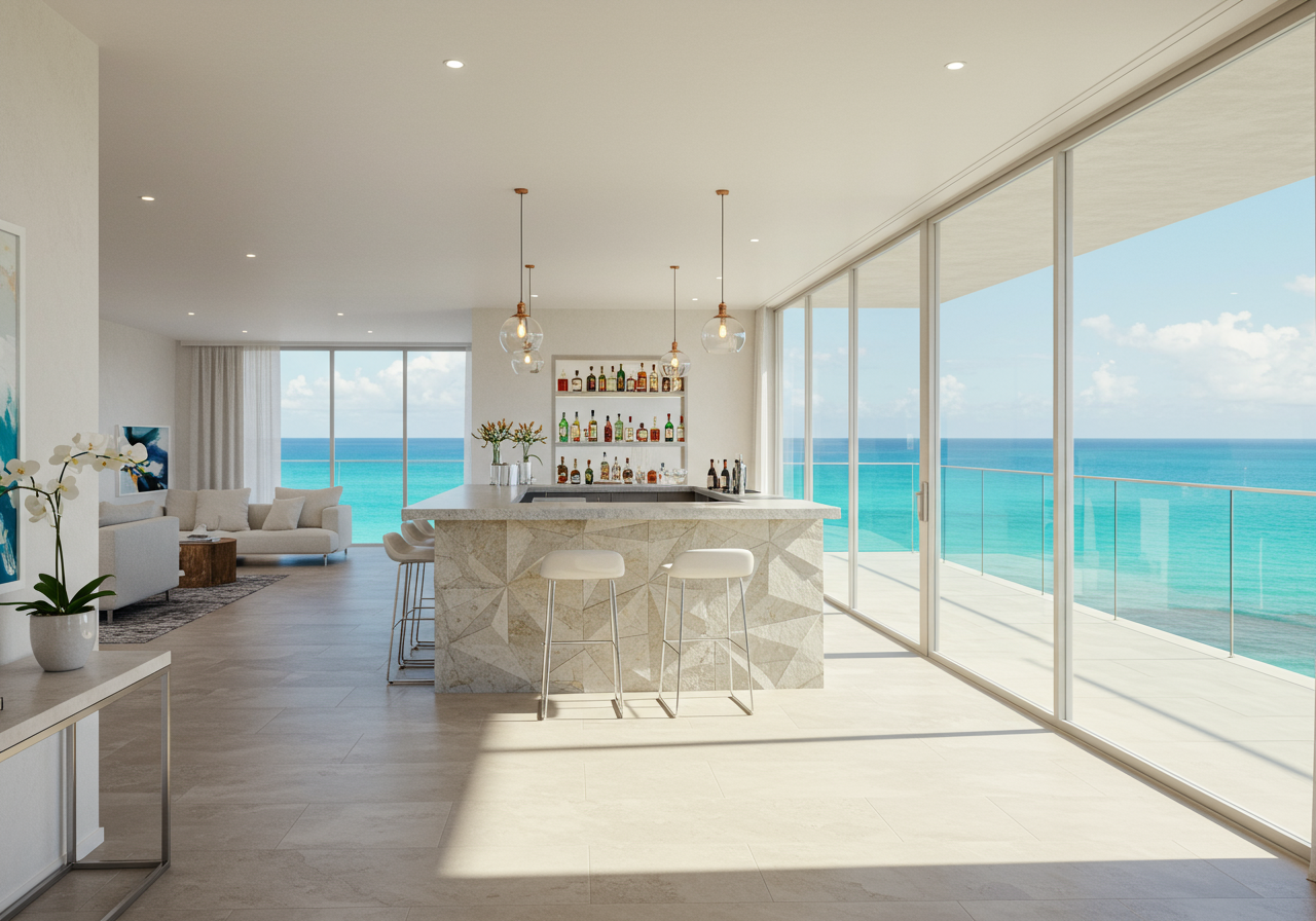 This deluxe penthouse on the top three floors of the new beachfront Regalia condo tower offers a private pool, a theater, an interior glass elevator, a game room, a wine cellar—and a primary bathroom that cost a cool $1 million to build and outfit.