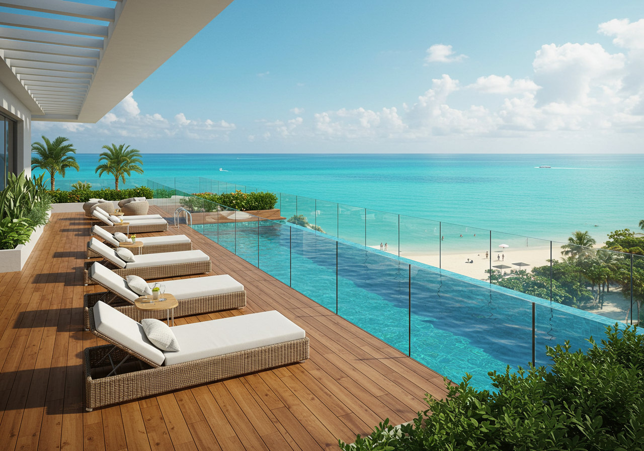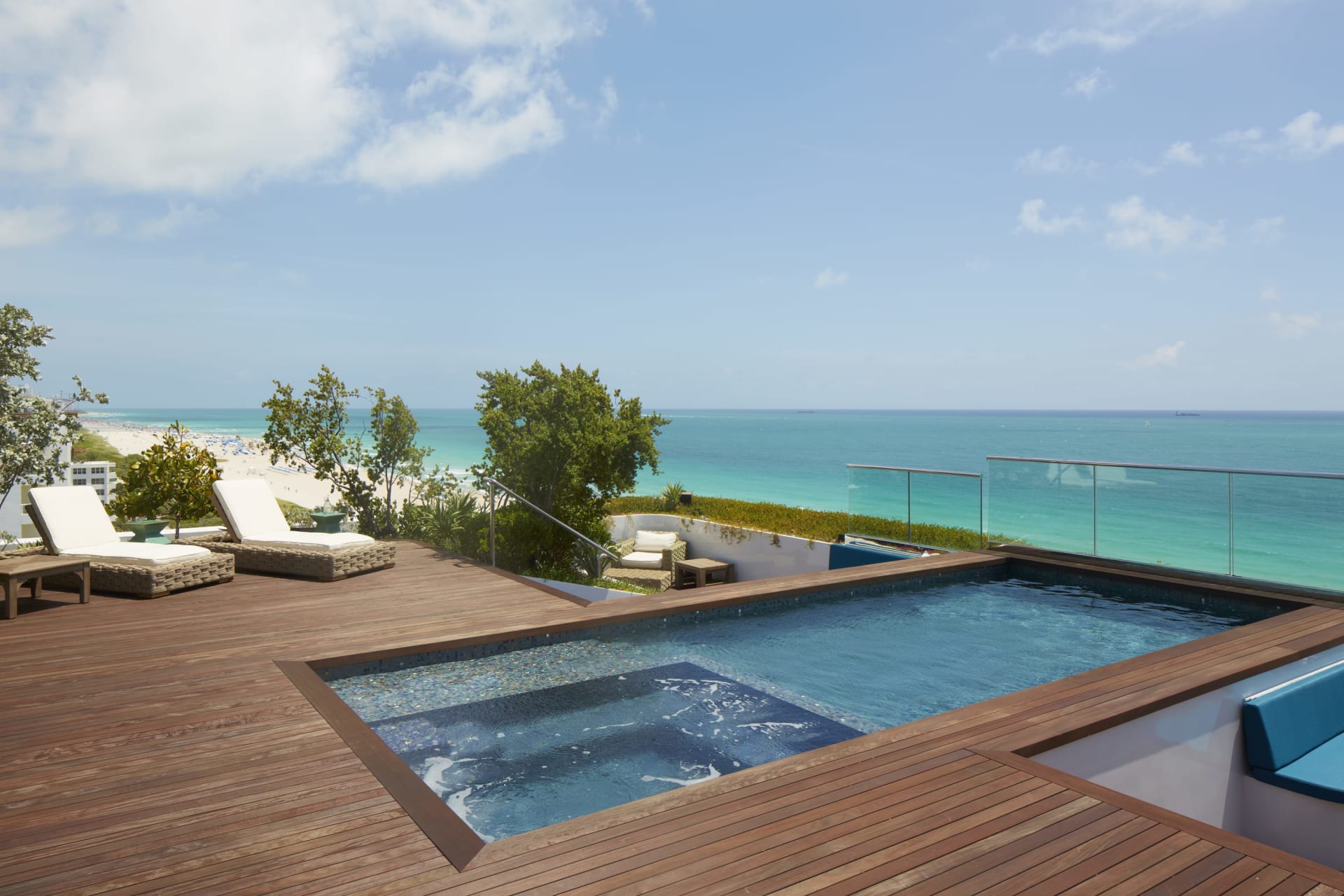 The 10th-floor penthouse has two bedrooms and measures about 1,880 square feet, with ocean views from nearly every room, Mr. Miller said. There are two terraces off the living room. A staircase leads to the 11th-floor private roof deck, where an infinity pool and Jacuzzi overlook the ocean. The unit is being sold fully furnished, Mr. Miller said.