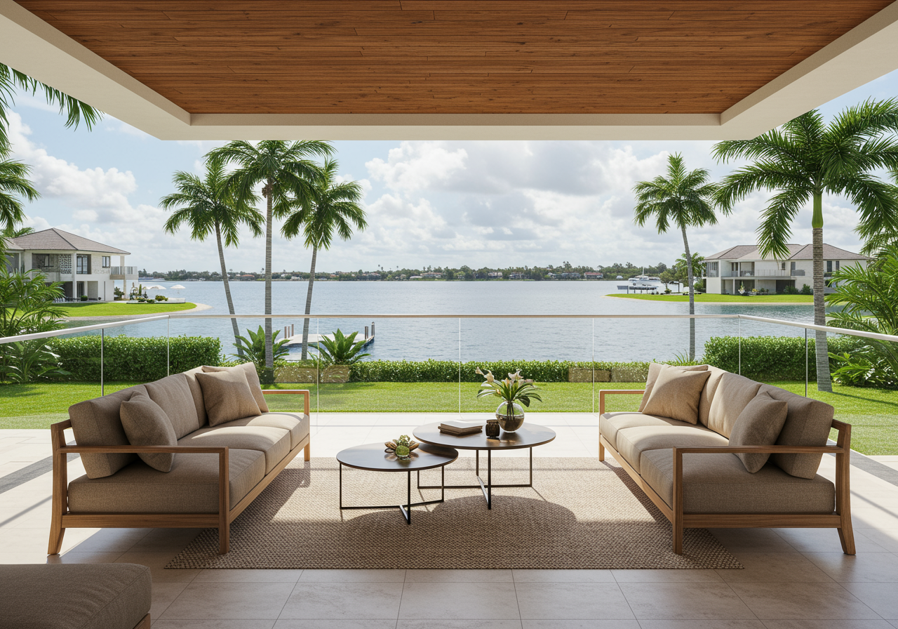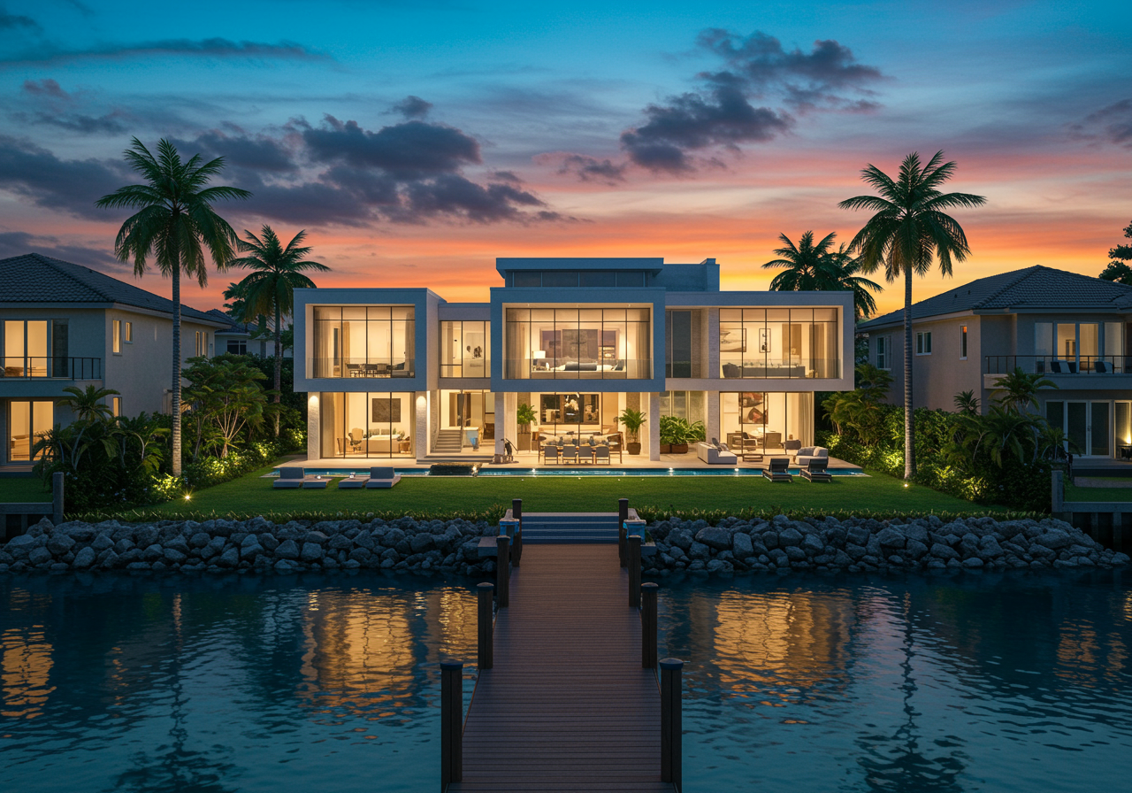 The 11,058 square foot waterfront home, designed and built by Sabal Development, features eight bedrooms, eight full bathrooms and three half bathrooms and a separate guest house above a six-car garage.