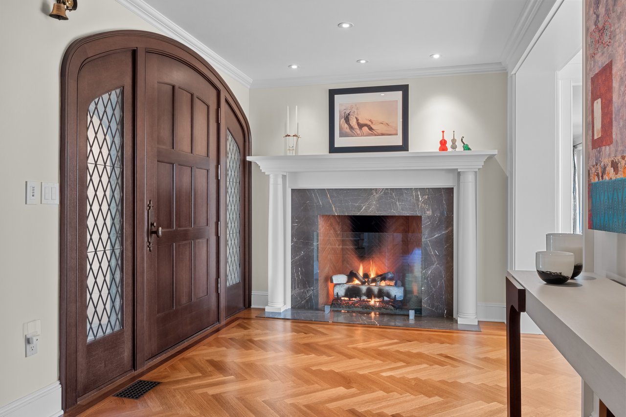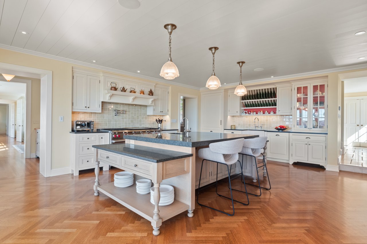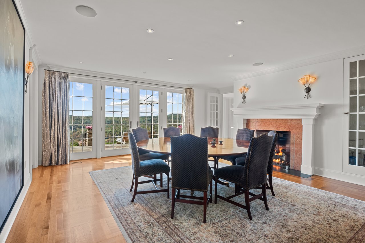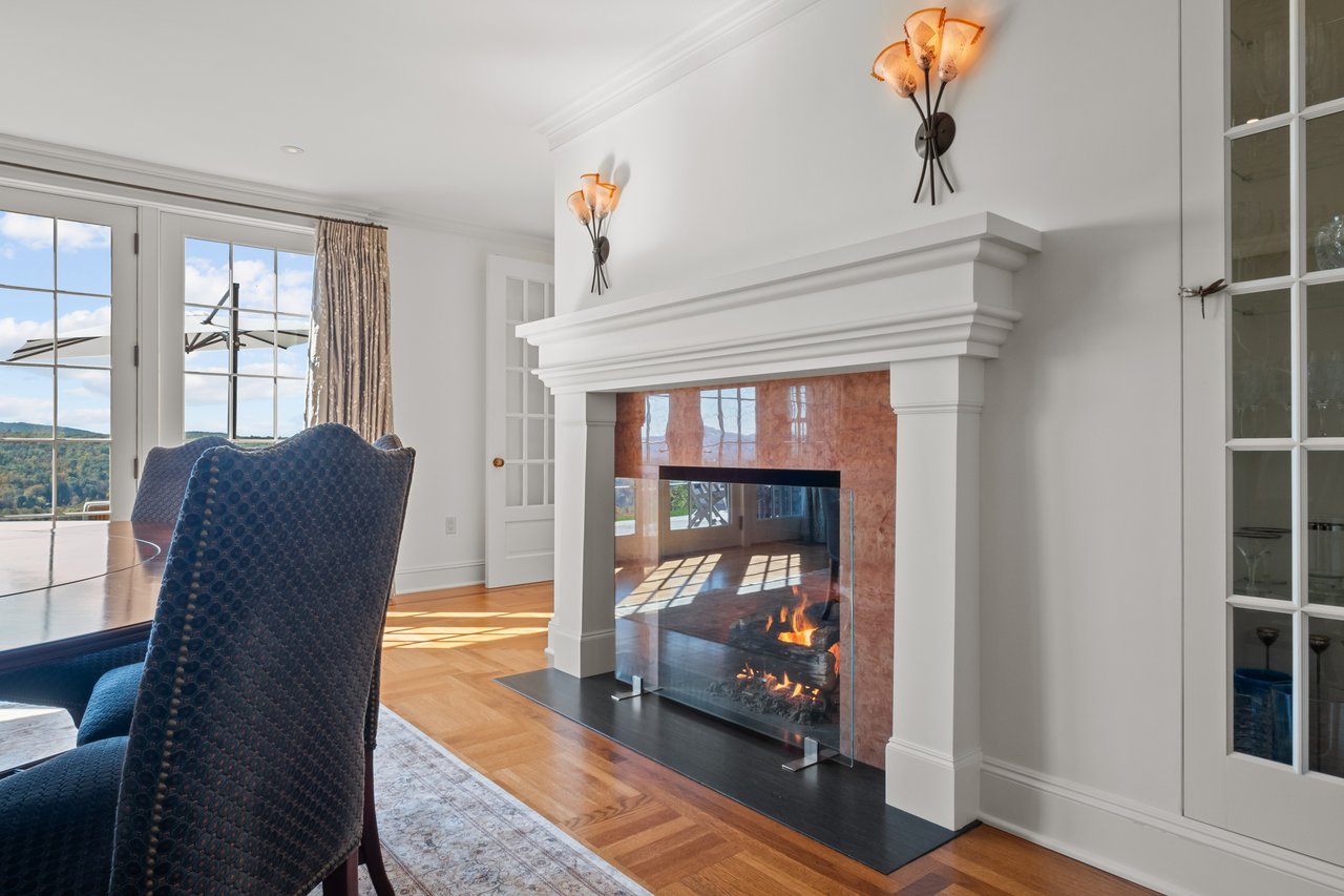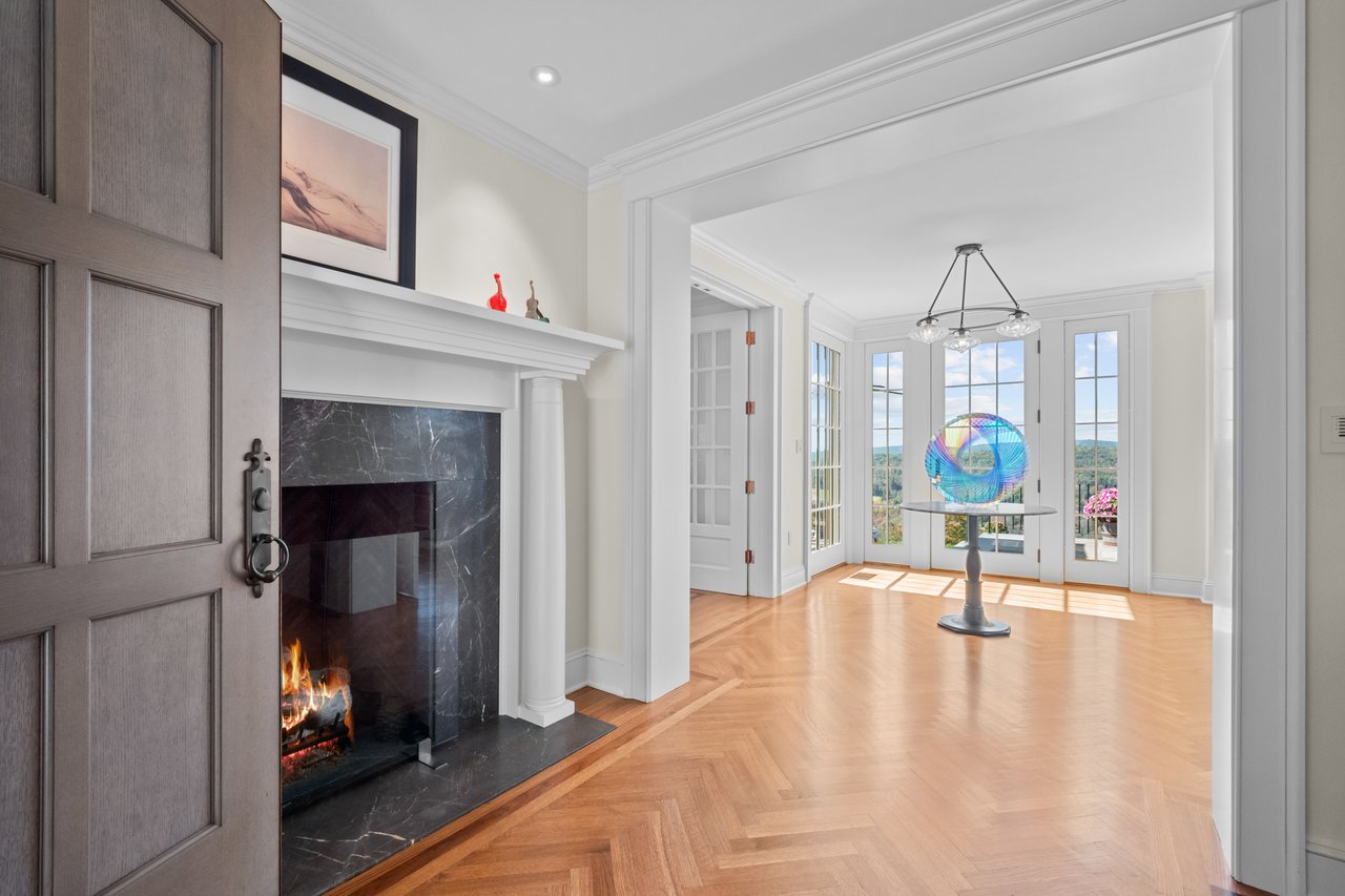 Enter through stone garden walls and arrive at a formal entry warmed by a fireplace—a signature welcome that sets the tone for the rest of the home. The grand kitchen, complete with a professional Wolf range, breakfast nook, and fireside sitting area, anchors the main level. From here, French doors open onto a full-length stone terrace with panoramic views—ideal for entertaining or quiet evenings watching the sunset.